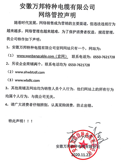 鄭重聲明:安徽萬邦特種電纜有限公司官方網站為:www_wanbangcable_com.100ksb.com,除此之外無任何子網站或合作網站,其余均為假冒偽劣。電話:0550-7621728 13485756353 地 址:安徽省天長市滁州高新技術產業開發區經四路29號